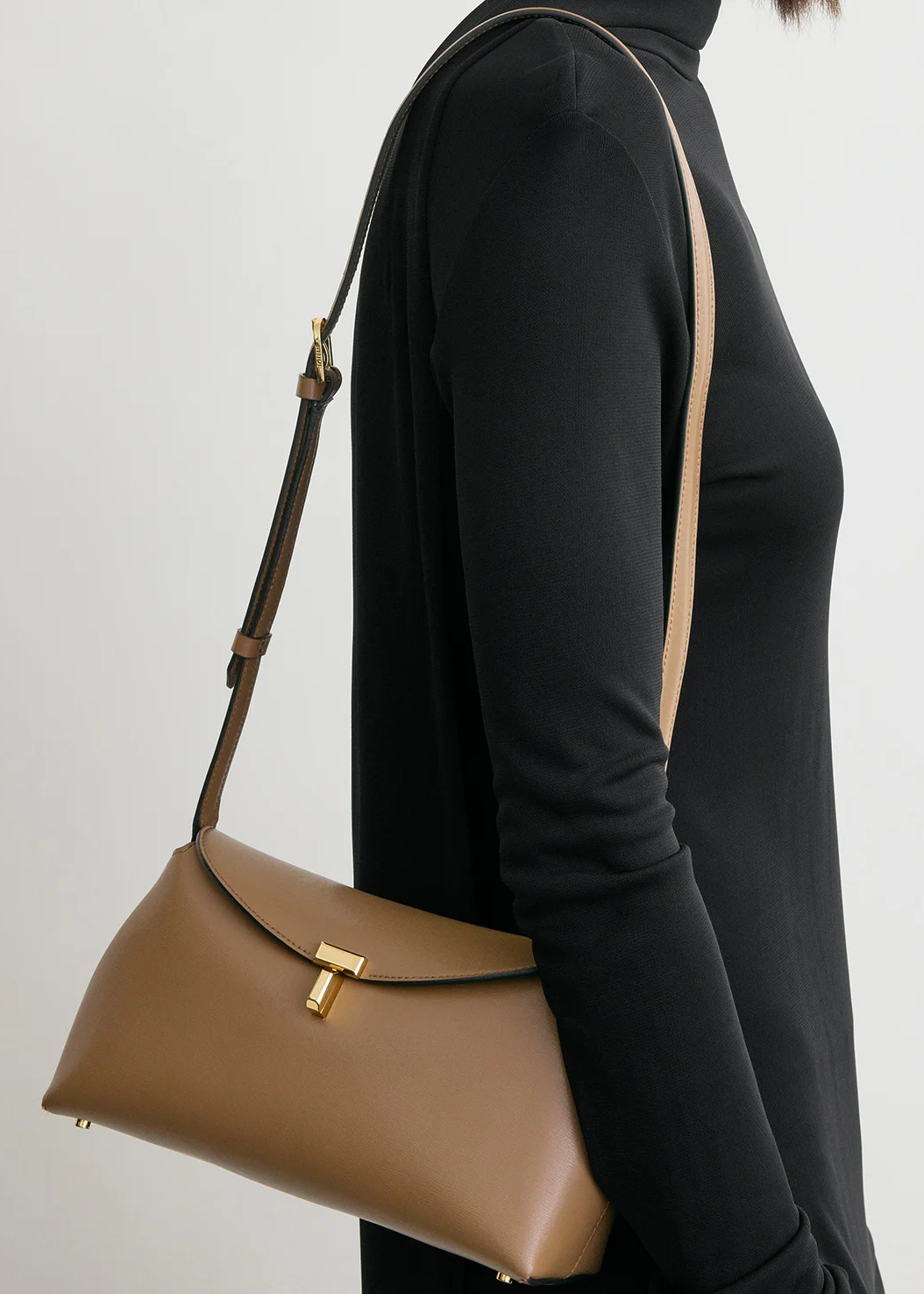 It has a removable strap, which is so useful. I always buy bags with straps. However, aesthetically, the Toteme T Lock clutch looks best when carried… as a clutch. We often recommend multifunctional bags that 1) are practical on their own, 2) have a strap and 3) and can be worn in more ways than one.