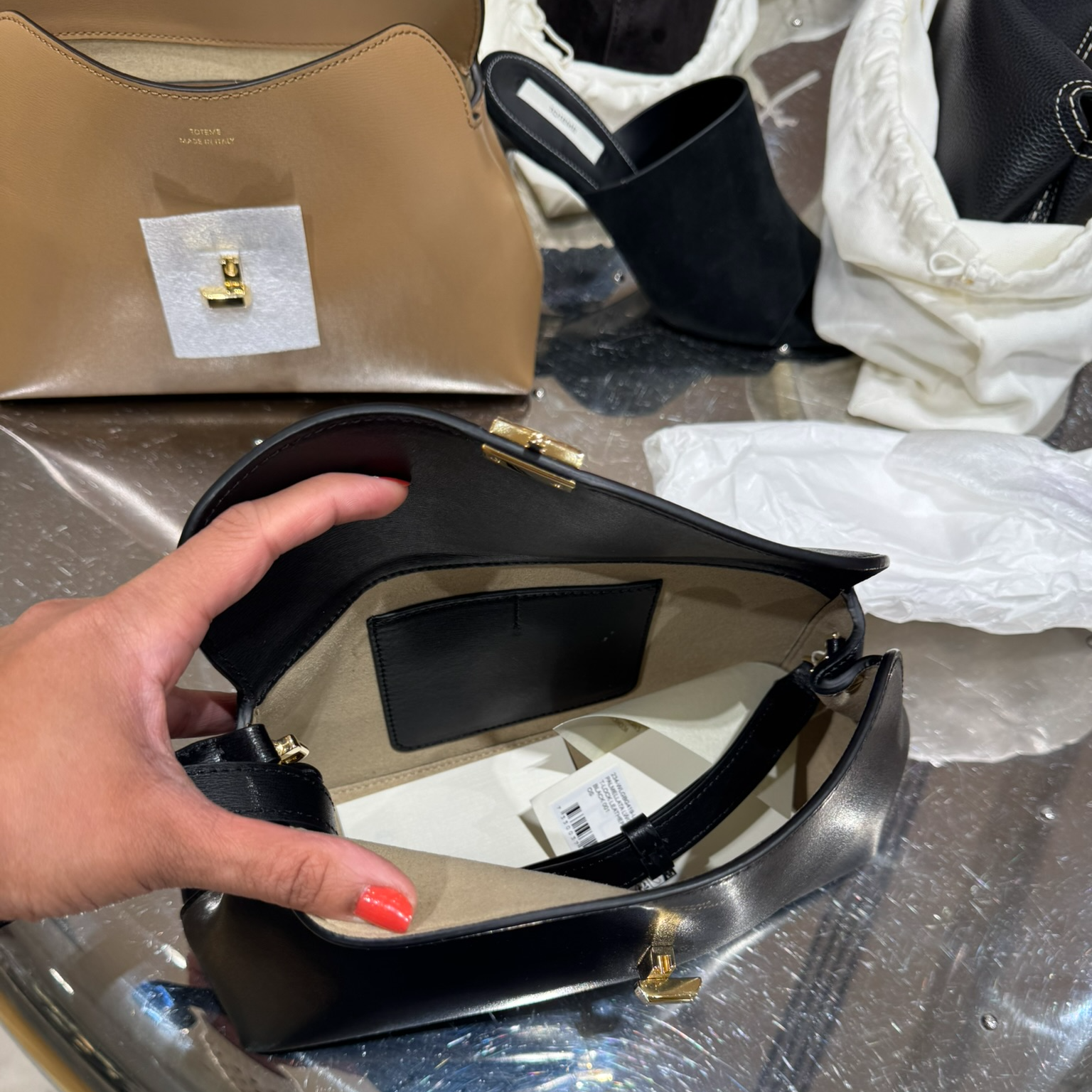 One of the most common questions for the Toteme T Lock is which size should you buy? The clutch or top handle?