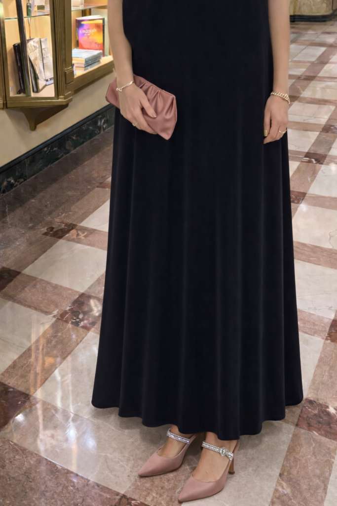 Aim for around 70mm – 75mm. A slightly higher heel keeps a shorter hemline feeling elevated. If you are debating between two heights, choose the slightly higher one. It photographs better and feels intentional.